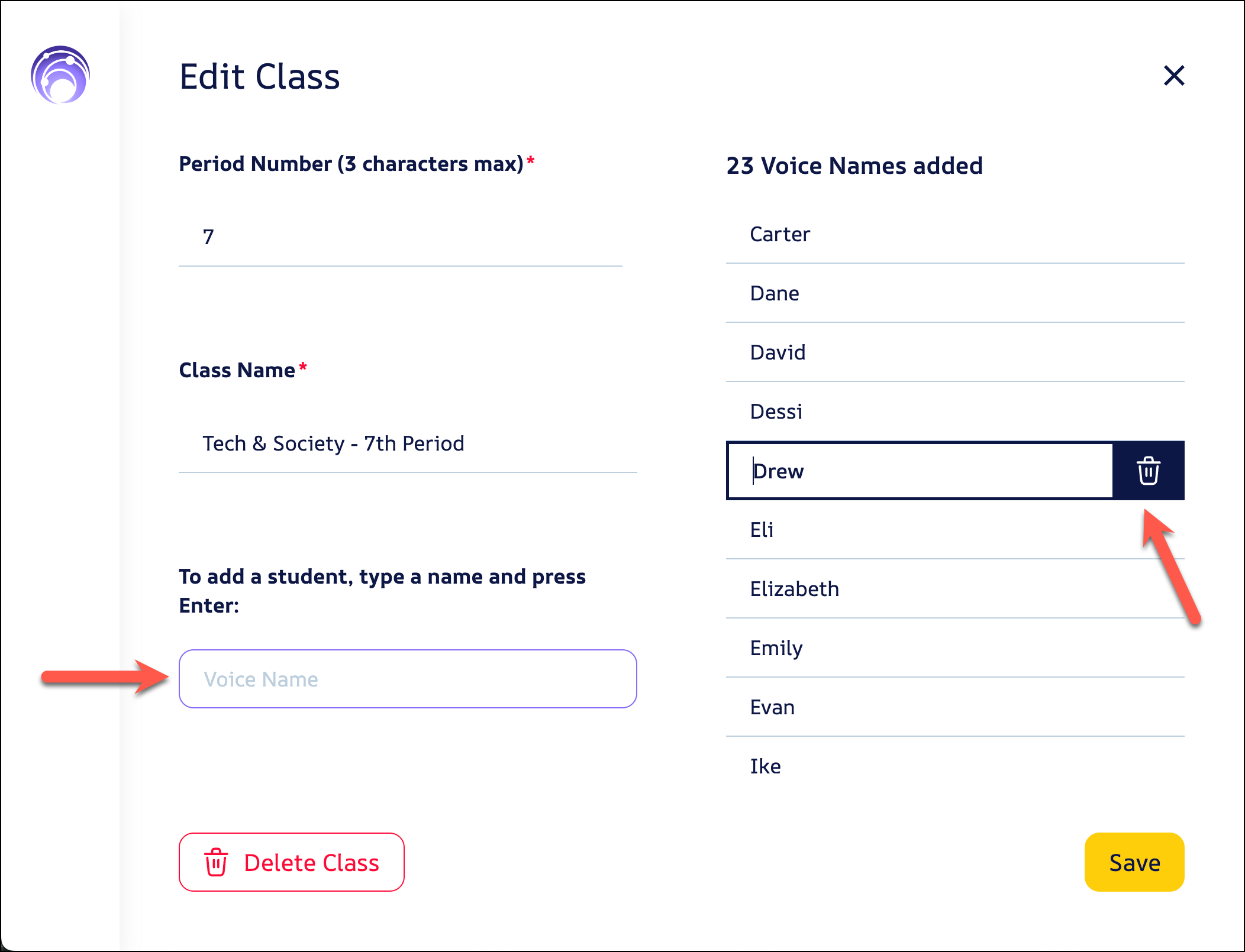 To remove a student, click on the student name and then press the trashcan icon.
