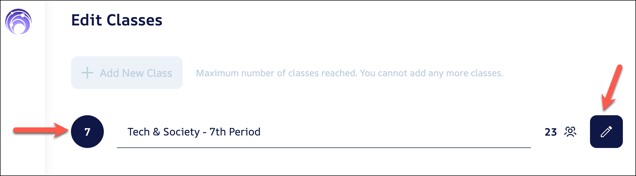 Because you're using Socrait Spark teacher, you'll only have one class in this interface. Click on the class or the pencil icon to go to the editor.